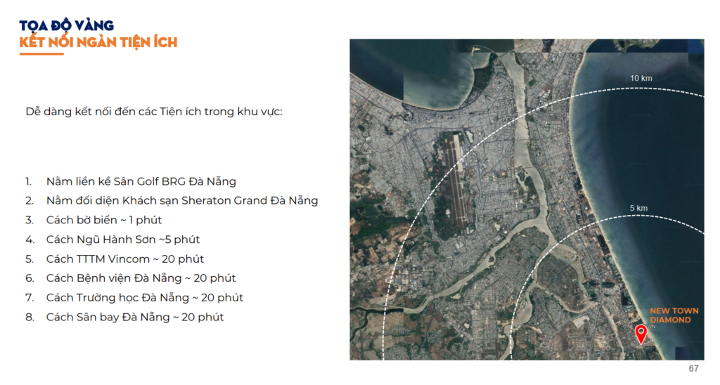Tọa lạc ngay trung tâm quận Ngũ Hành Sơn, Newtown Diamond Đà Nẵng sở hữu vị trí “vàng” khi bao quanh bởi hệ thống tiện ích ngoại khu đẳng cấp. Từ dự án, cư dân dễ dàng tiếp cận hàng loạt tiện nghi hiện đại như trường học quốc tế, bệnh viện, chợ địa phương, trung tâm thương mại, khu vui chơi giải trí và hệ thống nhà hàng cao cấp. Cuộc sống tại đây không chỉ thuận tiện mà còn đầy đủ mọi trải nghiệm sống lý tưởng cho mọi thế hệ.