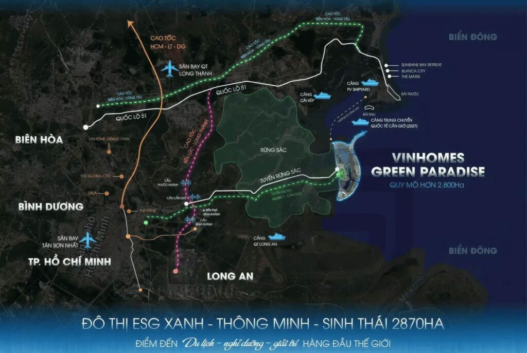 - Sân bay Quốc tế Long Thành – Cửa Ngõ Ra Thế Giới: Siêu dự án này đặt Vinhomes Cần Giờ vào vị trí chiến lược để đón dòng khách du lịch, chuyên gia và nhà đầu tư toàn cầu. Với công suất thiết kế lên đến 100 triệu hành khách/năm và chỉ cách dự án khoảng 30-40 phút di chuyển, Sân bay Long Thành đảm bảo một nguồn cầu dồi dào và bền vững cho các sản phẩm bất động sản nghỉ dưỡng, khách sạn và MICE tại Vinhomes Cần Giờ.